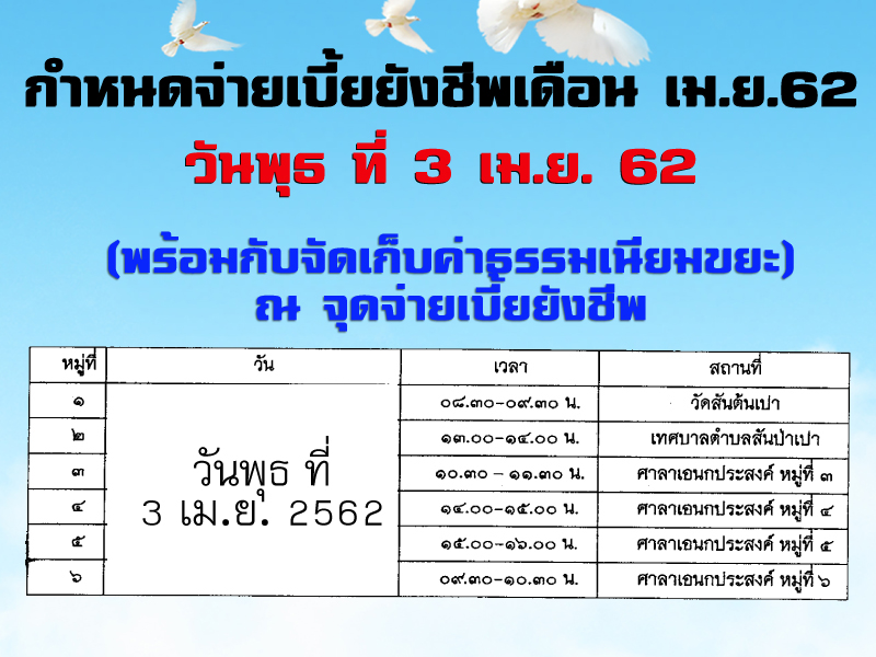 จ่ายเบี้ยยังชีพ และรับชำระค่าธรรมเนียมขยะ วันพุธ ที่ 3 เมษายน 2562