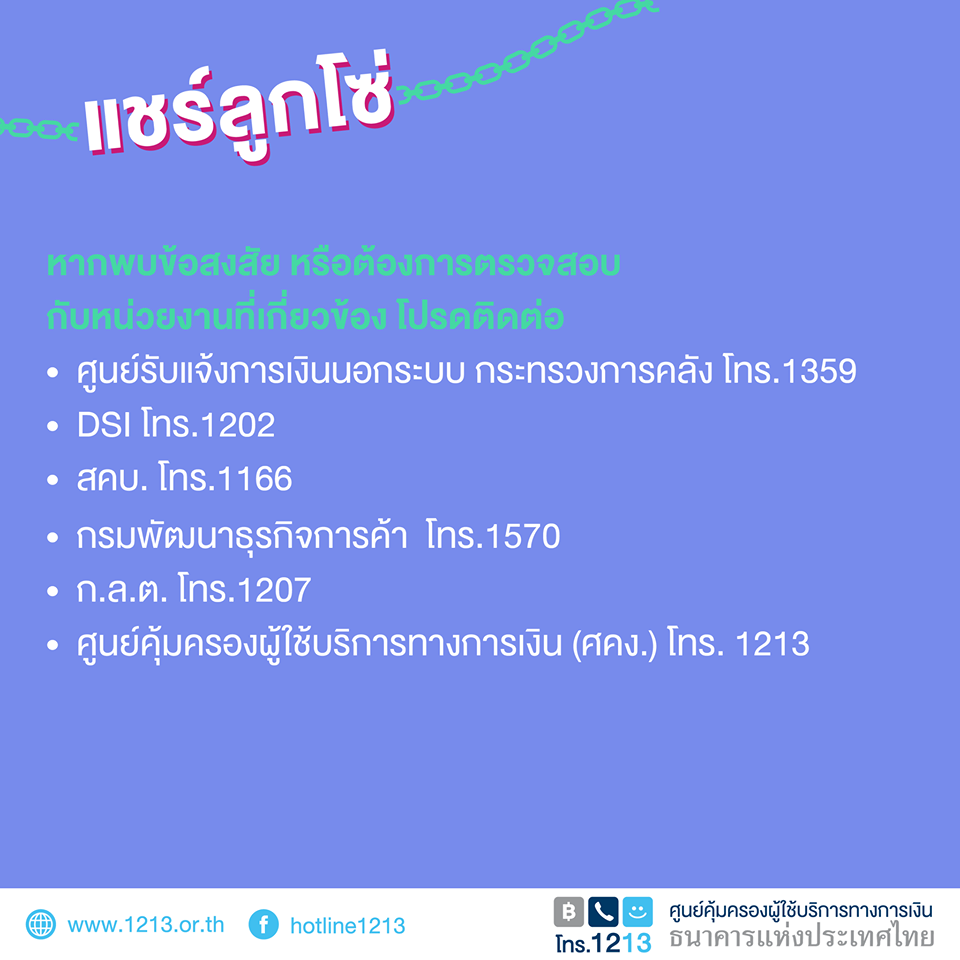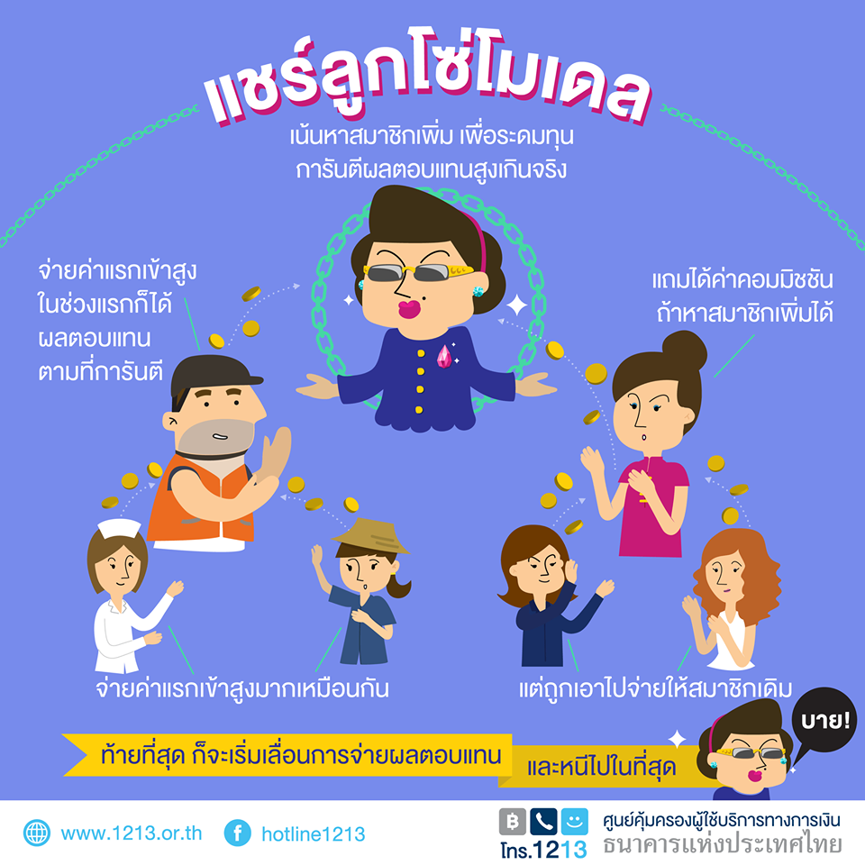 "แชร์ลูกโซ่" คือคำเรียกลักษณะการล่อลวงให้ลงทุนเป็นเครือข่าย ที่มุ่งหารายได้จากการระดมทุน โดยมักการันตีว่าสามารถให้ผลตอบแทนสูงในระยะเวลาอันสั้น ทั้งที่ความเป็นจริงไม่มีการลงทุน แต่นำเงินของสมาชิกใหม่มาเวียนเป็นผลตอบแทนให้สมาชิกเก่าตามที่กล่าวอ้างในตอนแรก เพื่อสร้างความน่าเชื่อถือและเมื่อไม่สามารถหาสมาชิกใหม่มาลงทุนเพิ่มได้ ก็จะไม่มีเงินมาจ่ายผลประโยชน์ ตอบแทน ตามที่สัญญาไว้และในที่สุดก็ต้องปิดกิจการหนีไป ซึ่งในปัจจุบันสถานการณ์การหลอกลวงประชาชน ให้ร่วมลงทุนในลักษณะแชร์ลูกโซ่ มีลักษณะการชักชวนที่หลากหลายมากขึ้น ประชาชนควรพิจารณาก่อน ตัดสินใจร่วมลงทุน เพื่อไม่ให้ตกเป็นเหยื่อ ![]() ![]() |