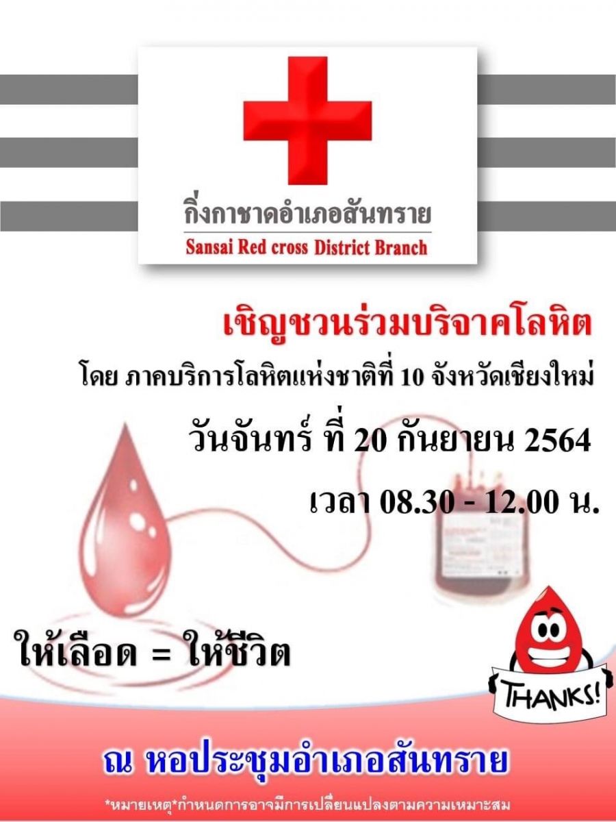 ในวันจันทร์ที่ 20 กันยายน 2564 ตั้งแต่เวลา 08.30-12.00 น. ณ หอประชุมอำเภอสันทราย เพื่อนำไปช่วยเหลือผู้ป่วยและผู้ที่ประสบอุบัติเหตุที่ต้องการโลหิตอย่างทันท่วงที ซึ่งในการดำเนินการรับบริจาคโลหิต ทางอำเภอสันทรายและกิ่งกาชาดอำเภอสันทรายได้ดำเนินการตามมาตรการป้องกันการแพร่ระบาดของโรคติดเชื้อไวรัสโคโรนา 2019 และขอให้ทุกท่านดำเนินการตามมาตรการ D-M-H-T-T-A ค่ะ