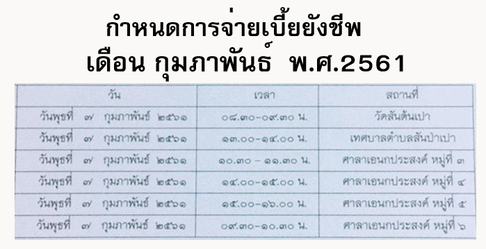 กำหนดการจ่ายเบี้ยยังชีพเดือน กุมภาพันธ์ 2561